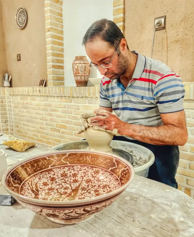 Zarin-fam ceramics are created through a three-stage firing process in a kiln. The third stage, carried out under reducing conditions with precise control of temperature and smoke, is when the lustrous Zarrinfam(lusterware) glaze forms. This stage is the most delicate part of the process and is considered the key to the art’s secret.
